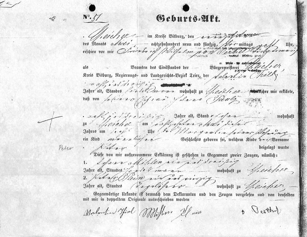 1 Vertaalde geboorteakte van Pieter Thiel |